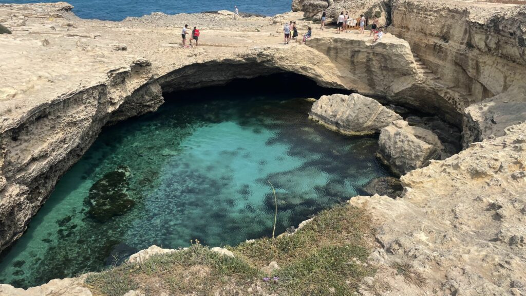 Le Due Sorelle — the Two Sisters — are twin sea stacks rising from the water in front of Torre dell’Orso. According to legend, two sisters, after a long day’s work in the fields, went down to the sea to cool off. One was so enchanted by the sound of the waves and the scent of the salt air that she fell, almost hypnotised, from the cliff. Her sister dived in to save her, but the waves were too strong. The gods, moved by the tragedy, turned them both to stone — preserving their final embrace for eternity.