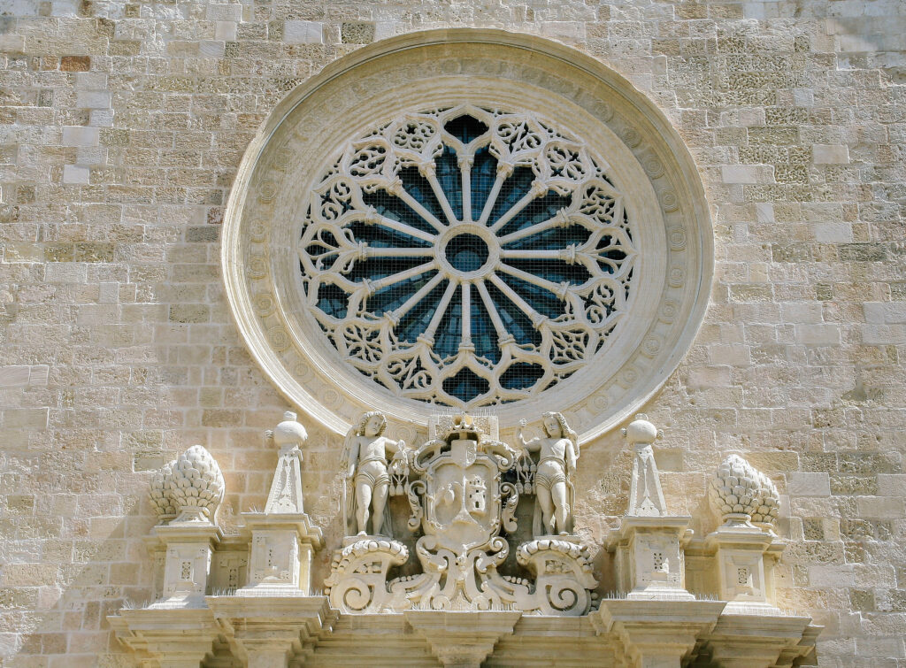 Perched on a hill, Ostuni boasts stunning sea views. Its distinctive whitewashed buildings have earned Ostuni the nickname “the White City.” At the heart of the city is Piazza della Libertà, home to the Church of San Francesco, the town hall, and the Column of Sant’Oronzo, which symbolizes devotion to the patron saint. The main street in the historic center, Via della Cattedrale, is lined with picturesque artisan shops and vendors selling delicious local products. At the end of the street stands the Cathedral of S. Maria Assunta, a prime example of late Apulian Baroque architecture. Nearby is the Scoppa arch, said to be inspired by the Ponte dei Sospiri (Bridge of Sighs) in Venice.